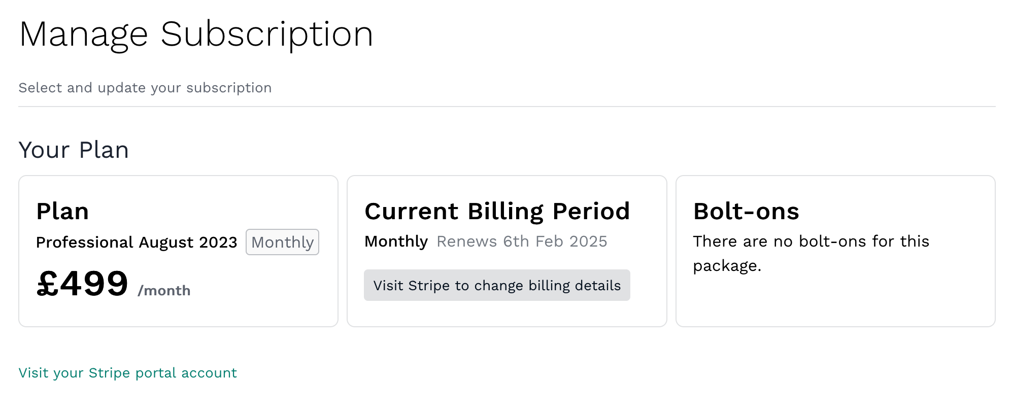 To manage and update your current payment method, under the Current Billing Period, there is a button to Visit Stripe to change billing details. Clicking this will take you off to Stripe, the payment provider where you can update your payment details.