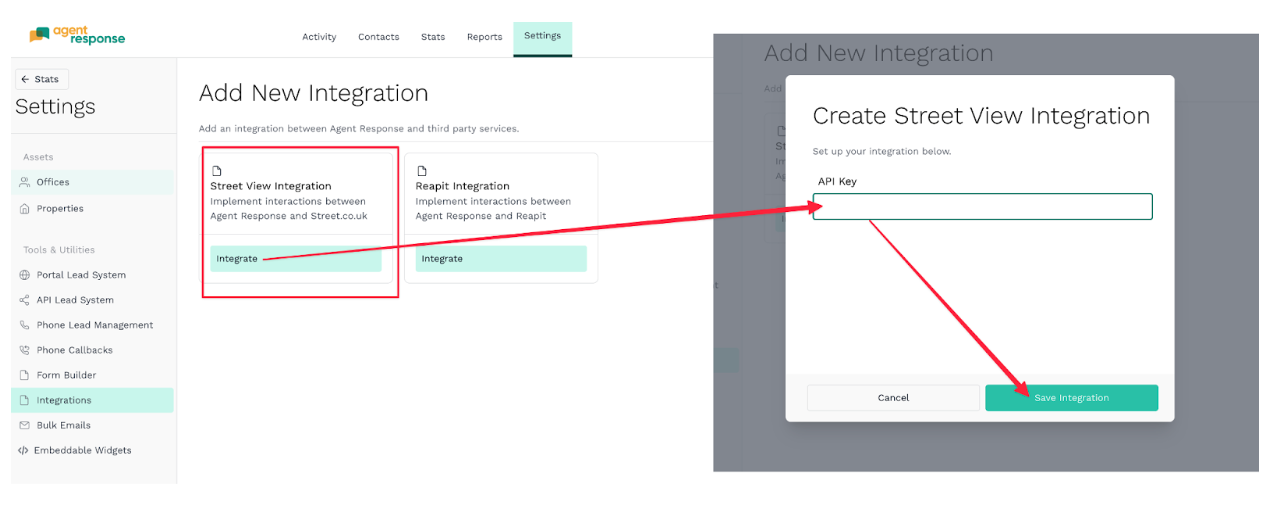 Connecting Agent Response to your Street.co.uk accountTo integrate Street.co.uk, log in to your Street.co.uk account and go to the Application page to create an API token. https://street.co.uk/agent/settings/api/tokens Select ‘Open API’ and add your contact details.
