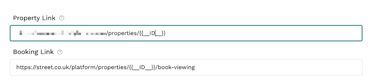 The booking link is the preferred URL where you want leads to book viewings for a property. This could be Street (default) or another service. The dynamic fields also work here.